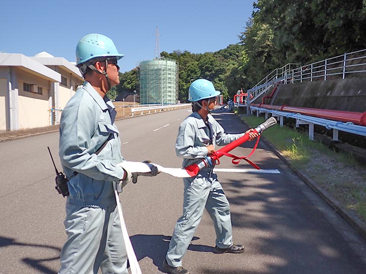 先日、社内防災訓練を実施しました。 波方ターミナルは山間部と隣接していることから、山林火災を想定した訓練を行いました。