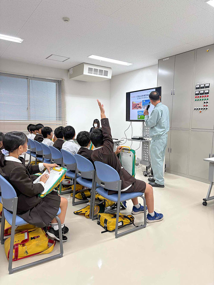 雨が降っており見学場所も限られていましたが、LPガスを液体に変化する実験や、作業トンネルの見学。また、質問コーナーでは「タンクの大きさはどれくらいなのか」「働く上で大変なことはなにか」など沢山質問してくれました。